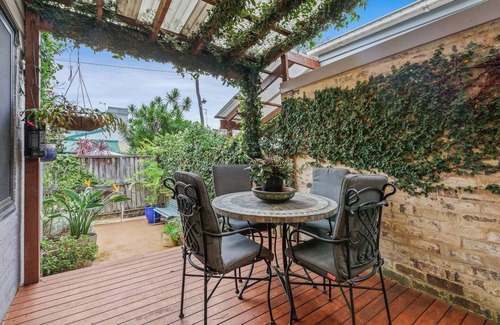 The open-plan layout flows into a contemporary kitchen equipped with a gas cooktop, oven, dishwasher, and all the cooking essentials. A breakfast bar and an intimate dining table make mealtimes enjoyable. For a laid-back afternoon, step onto the leafy patio where a vine-draped pergola and a mosaic dining table create the serene setting for relaxed alfresco meals. Just beyond, the private garden is a tranquil hideaway filled with vibrant potted plants, climbing ivy, and lush greenery, and a classic bench inviting you to soak up the sunshine.