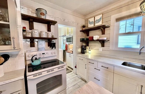 Enter from the porch you walk into the historic Craftsman style family room w/ smart TV and sectional sofa. The dining room is on your left, with extendable table and plenty of seating. Continue into the fully stocked kitchen. 1st floor Laundry room is just off the kitchen. The back door off the Kitchen leads to a utility room w/ 1/2 Bathroom. Continue out the backdoor to the fully fenced backyard. The private outdoor shower is on your right.