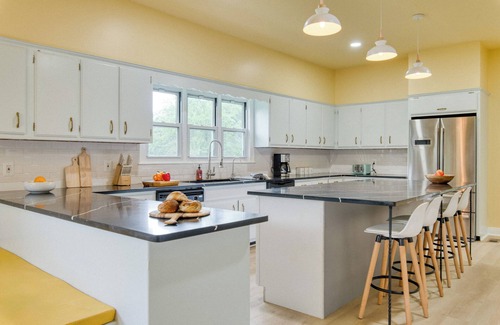 Nestled on 10 acres in the picturesque Catskill Mountains, Game Farm Villa's lush landscape is complete with serene waterfalls, open fields, and a private pond. The backyard is a haven of fun and relaxation, featuring a sparkling pool for sun-soaked afternoons, a hot tub for a soothing soak, and a fire pit where stories and s'mores await under the starlit sky. The private pond on the property invites activities for everyone to enjoy. Go for a stroll across the bridge and immerse yourself in the serene surroundings, or hop in the pedalboat for an aquatic adventure.
