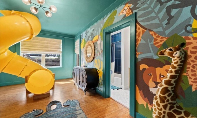 Welcome to Whimsical House of Mr. Windsor, a one-of-a-kind retreat in Guyton, GA, just outside Savannah. This 4-bedroom, 3-bath home is bursting with playful charm and family-friendly fun, making it the perfect escape for guests of all ages. Professionally designed with bold colors, custom furnishings, and eye-catching wallpaper, every corner of this home tells a story. The candy room, nestled between the kitchen and dining room, adds a sweet surprise, while the large upstairs game room—featuring a Pac-Man arcade, smart TV, and cozy seating for movie nights—promises hours of entertainment. For the young and young at heart, the Zoo Room steals the show with a mural, bunk beds designed like animal cages, and a slide that leads straight from the game room! Three of the four bedrooms feature king-sized beds, including the primary suite with an ensuite bath and walk-in shower. A charcoal grill, firepit, and spacious yard invite outdoor gatherings under the Georgia sky. Whether you're looking to unwind with loved ones, embrace the home's whimsical charm, or create unforgettable memories, this enchanting retreat is sure to delight.
