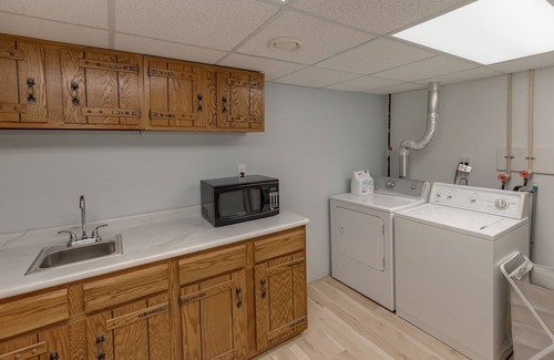 This two-level home features four bedrooms on the main floor, accompanied by a spacious family room downstairs with two convertible twin beds and a full-sized futon.