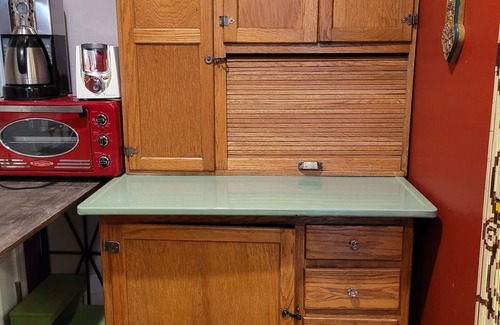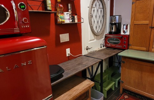 Kitchenette has apartment-sized fridge with separate freezer section, microwave, toaster, toaster oven, air fryer, rice/slow cooker, conduction cookplate, coffee maker, smoothie blender, and kettle, water dispenser. Conduction cook set, colandar, mixing bowl and cutting board as well as utensils provided. Dishes and cutlery for 4.