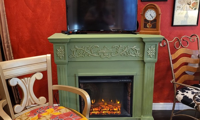 Electric fireplace provides ambiance and warmth with no clean up. TV has Roku and air antenna.