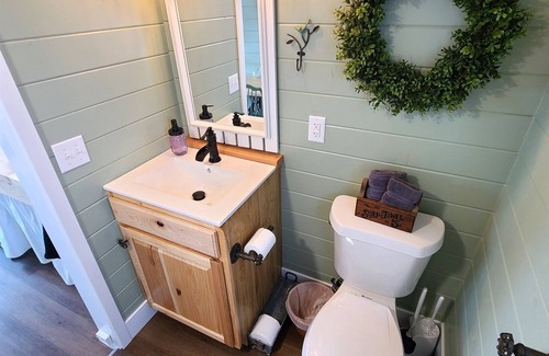 A white picket fence loft railing is just the thing for this house. The loft has a snug queen-sized bed outfitted with luxury linens for you to dream away about fields of flowers. Sip a cup of organic coffee as you relax and read one of our many lovely books on gardening or hummingbirds.