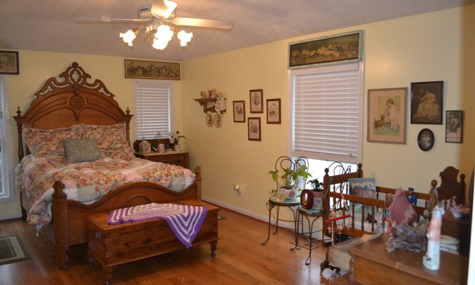 Spring is in the air all year in “The Garden Room”. You’ll feel like you’re sleeping outside in a garden under the flowery, fluffy comforter on the double bed and looking at the antique garden décor. Beautiful antique prints showing birds, butterflies, “Yard scenes” enhance the décor. We’ve included a beautiful antique cradle, complete with Dave’s baby toys and my Barbies. The private bath has a shower, but not a bathtub. But, you’ll still get to use locally made bath products to enhance your visit.