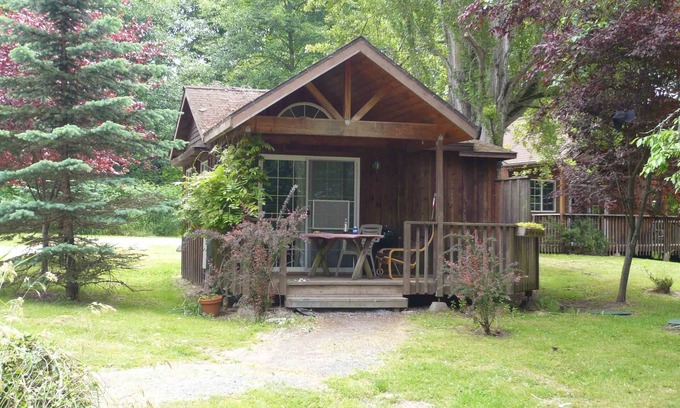 This small studio-style garden cabin is located next to our wildlife pond and has a partial view of the water. Perfect for honeymooners or travelers on a budget, this unit is private, cute, and cozy. Maximum occupancy is two. Well-behaved pets are welcome by prior arrangement. Adjacent parking. This is a no smoking cottage. Full WiFi connectivity and satellite TV.