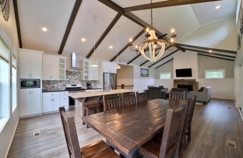 Built in 2021, this spacious 4-bedroom, 5-bathroom home offers over 3,450 sq. ft. of thoughtfully designed living space. With a blend of contemporary style and warm Northwoods charm, guests enjoy elevated finishes, multiple gathering areas, and entertainment-focused amenities including a 4-season porch with fireplace, game room with pool table, and a private fire pit patio.