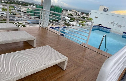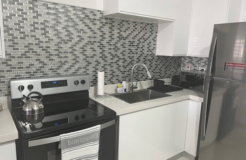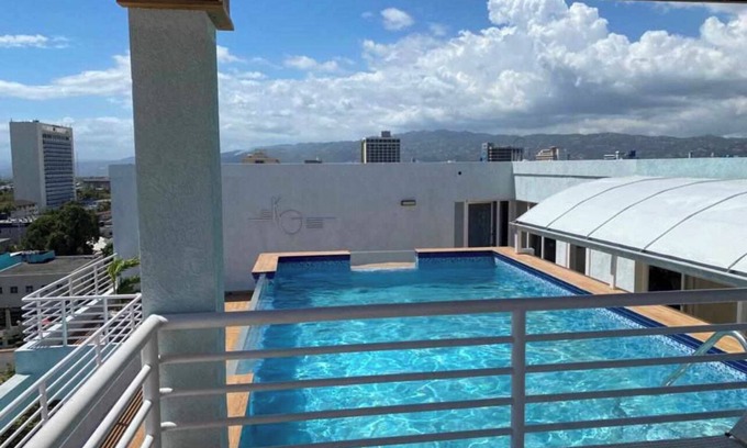 Stay at my secure private luxurious condo. It is a new fully-furnished 1 bedroom on the 4th floor with a lovely balcony and view of Kingston's harbour, New Kingston's skyline & airport in the distance. It is gated with 24 hr security, secure parking and a gym. Sleep well in our King bed in a spacious bedroom, luxurious furnishings with air-conditioning and state of the art washer/dryer combo for all your convenience. On top of that is the rooftop pool for you to enjoy especially at sunset.