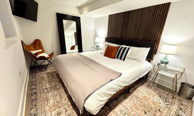 The apartment can comfortably accommodate four adult guests. The private bedroom includes a king bed with memory foam mattress, comfortable bedding, temper pedic pillows, HDTV, and a closet with room for storage, an iron and ironing board, and extra linens.