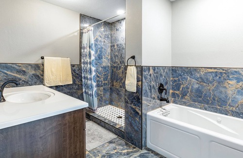 This 5 bed / 3 bath property that comfortably can sleep multiple families sits on almost an acre lot, oversized deck, and a huge backyard for privacy. Dedicated workspace (5th room) downstairs with two futons (1 full and 1 queen) in case you need extra beds!