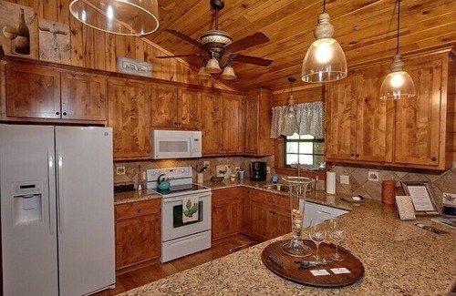 When you arrive, you will love the solid hickory floors. Additionally, the knotty Alder cabinets and a beautiful limestone fireplace in the great room invite you to stay a while. Each bedroom was inspired by a local wine. The Tannat Master Suite has a king size bed, sitting area and private bathroom. The Tempranillo Suite has a queen size bed and a semi-private bathroom. The great room has a vaulted ceiling and plenty of cozy seating. Situated in front of the fireplace is a luxury leather sofa with a queen size pull-out mattress that will inflate to 11 inches and has an adjustable headrest for reading, watching TV or staring at the fire. Gateway Cabin has a fully equipped kitchen with a long island and three counter stools. The front porch spans the entire length of the cabin and is a great spot to enjoy your morning coffee or evening glass of wine. The back porch gives you a wonderful sunset view as well as access to the shared courtyard. No smoking, no pets and no children in this home, please.