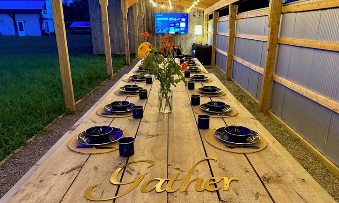 Guests at Hector Meadows Ranch can enjoy the flexibility of group gatherings with both shared and private spaces. Each space offers its own dedicated parking, private fire pit, and outdoor area. Your group will have exclusive access to 15 acres of meadow trails, swimming and wildlife ponds, and group-friendly amenities like games, communal fire pits, and covered gazebos make it the perfect destination for both privacy and connection.