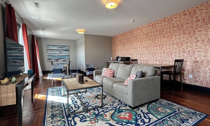 Gorgeously styled 4 bedrooms and large living area in a wing at the Historic Hotel Hartington in downtown. Guest will have a 4 private bedrooms along with 3 private bathrooms in their Gatsby Hat wing. Additional bedrooms/bathrooms available to rent upon request in the wing. Please inquire. There are 2 other bedrooms/bathrooms in the wing, but there will be no other guests allowed access to your wing or area and is locked for your security. You will have a large living room area with big screen TV with Hulu Live and voice activated Alexa. There is a Keurig machine with coffee pods, microwave, and mini fridge. We ask you don't take extra amenities with you after check out. We try to give excessive amenities to our guests in hopes they respect the space.