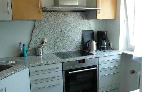 The pretty apartment is ideal for 2 people, modernly furnished, has a small entrance area with wardrobe and wardrobe, a bright combined living room / bedroom (22 sqm) with large double bed, stereo and flat-screen TV, glass front across the entire width and door to Balcony, a separate beautiful kitchen and a modern bathroom with bath / shower and toilet.