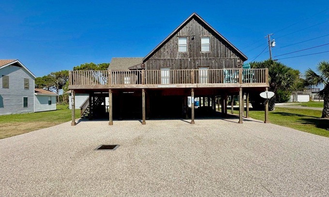 Classic POC home with decks and porches galore! Walking Distance to Kingfisher Beach and the Fishing Pier as well as Boggy Nature Park. WiFi and Direct TV are some of the amenities this multi-level bay home offers although there are plenty of outdoor spaces to keep you occupied. Nautically decorated with a country flare, this charming home has plenty of beds and private rooms to make for a comfortable stay for both large and small groups of vacationers. The main floor boasts two bedrooms with the kitchen and living room with access to its namesake, the fully enclosed furnished porch where you will enjoy the Gentle Breeze coming off Matagorda Bay. The top floor has one private bedroom with a window unit for more AC plus a loft great for the kids or other guests with four beds in a shared area. Did we mention decks? The brand new main floor uncovered deck is perfect for entertaining as well so bring the lawn chairs and get ready to relax and soak in the sun at this one of a kind vacation spot. Plenty of parking both in front of and under the Polk Ave side deck AND lot to the West side of the rental makes this a go-to property for those with boats, trailers or a side by side.