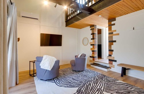 - NOTE: While this 2-story property offers step-free entry and a bed and full bathroom on the 1st floor, there is rugged terrain leading up to the entrance, 2 interior steps to reach the bathroom, 2 interior steps to reach the 1st-floor bed, and additional stairs to reach the 2nd bed in the loft