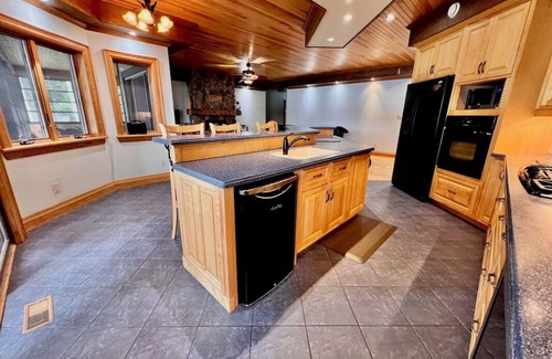 Kitchen details: equipped kitchen with breakfast bar for 5 , fridge, propane cook top, wall oven, microwave, drip coffee maker, and toaster