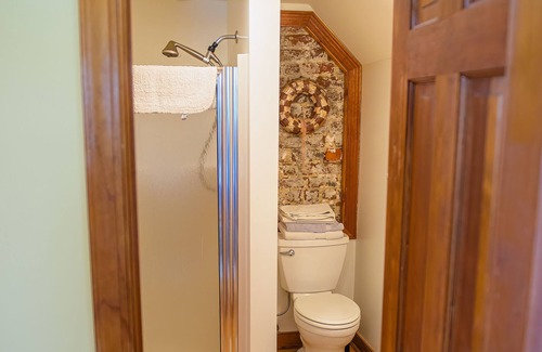 The house has since been beautifully renovated without losing any of its historical charm. Both bedrooms are upstairs; the master bedroom has a king sized bed with an attached two door bathroom for guest access, while across the hall is the guest bedroom which has two twin sized beds. Downstairs has a full kitchen, a second bathroom, a laundry and a living room. If necessary, the couch in the living room pulls out into a queen sized bed. The farmhouse itself comfortably accommodates four guests, but can fit up to six.