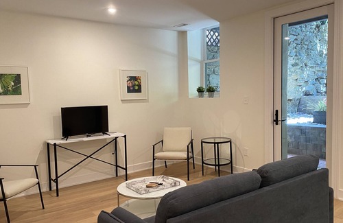 Welcome to this newly and fully renovated high-end boutique apartment building in the heart of historic Georgetown! The 120-year-old Kanawah Apartments now feature secure keypad entry, a small gracious lobby, leading to just 14 units, all but 2 of which are long term rentals. Unit 102 features a bright great room with open floorplan featuring large windows, high ceilings, light wood floors and recessed lighting. Entertain friends at the kitchen island while you prepare a repast in the large and fully stocked kitchen, watch a movie together while spread out in the roomy sitting area, or sit outside in the cool shade with a view of the upper garden. When it’s time to be productive you’ll appreciate the strong WIFI, tables, desk and counter to work at, and in-unit washer/dryer. This 1400+ SF apartment offers 3 bedrooms and 3 full bathrooms, 2 bedrooms have insuite bathrooms and all have ample closets with sliding doors and a window, the front bedroom features 3 large windows facing tree-lined Dumbarton St, the third bath is off the long hallway.