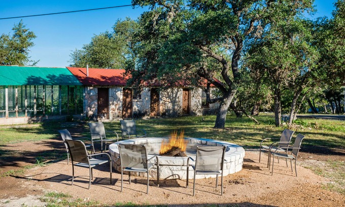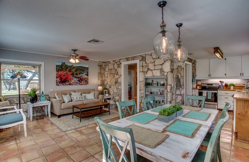 Gatehouse is located on a camp and conference center property on a ranch with over 500 acres of wide-open spaces along the Guadalupe River. This home is one of over 20 different guest properties on the ranch. The waterfront, pool, laundry facilities & activities are all shared spaces.