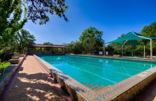 Yes, this Get away at Mo-Ranch! has a swimming pool. Check the Facility Overview section for details about the pool and other available facilities.