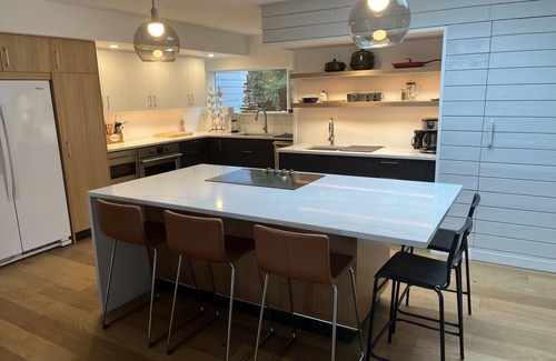 This executive style rental home of 2,000 sqft on 2.6 acres, recently renovated, surprises with lots of space and 100% privacy, lots of daylight from sky lights and large windows - but still is a cosy place for everybody in your group. The 2 main bathrooms just new or renovated in April 2022. A brand new kitchen with top notch appliances was installed in January 2023. You'll be amazed about the quietness and peacefulness of the surroundings! You'll experience a bright, architecturally unique home with a 1,300 sqft deck with ocean view, fully equipped kitchen and large living area. This home sleeps up to six adults.