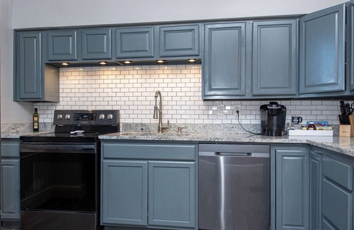 The home’s first level holds the traditional living spaces. A formal sitting room blends contemporary furnishings with an ornamental brick fireplace, making for a cozy environment where you can enjoy a movie on the smart tv or simply time spent relaxing. Pass through the dining room, furnished with both a dining table and casual barstool seating, on your way to the fully updated kitchen. The space includes standard appliances, a coffee maker, and all the cookware and tools you’ll need for convenient meals and drinks at home. Through the kitchen’s back door, exit onto the shared deck with neighborhood views.