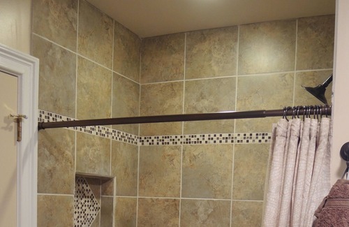 Beautifully tiled 34" X 48" custom shower in bathroom, accessible from both bedrooms.