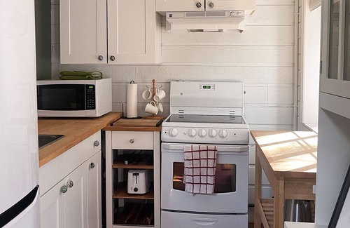 Inside, our cabin has everything you’ll need, with a kitchen, bathroom, workspace, and living room. After a day of relaxation, the cabin's pull-out couch transforms into a cozy bed.