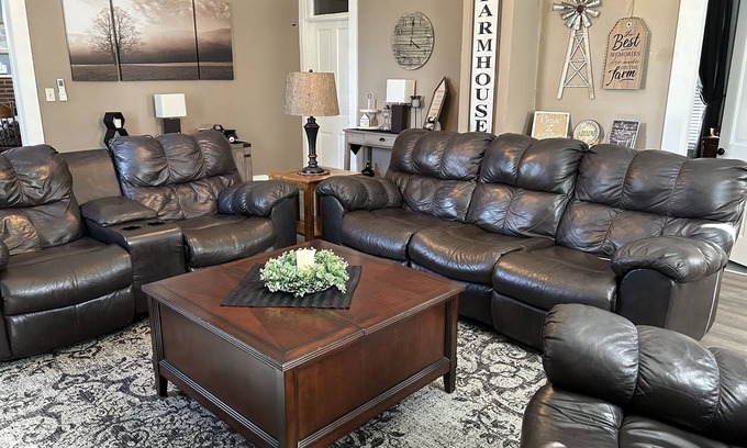 Cozy Living Spaces - Enjoy a spacious family room with original doors with original glass, tall farmhouse windows with the original woodwork, custom shades, comfortable leather reclining couch, loveseat, and rocker recliner seating. A large Smart TV with Roku, lift-top coffee table, creating a perfect space for unwinding or working remotely.