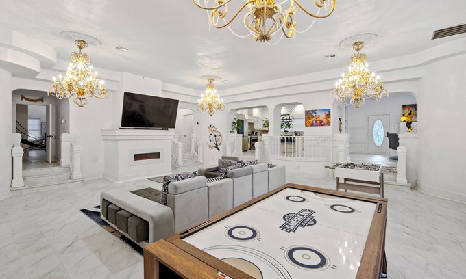 6 bedrooms 7 bath, 12 beds, 4 sofa beds, 2 air mattresses. Sleeps 25 comfortably. Perfect for large groups! Modern smart home filled with perks: air hockey, pool table, ping pong, foosball, 8 big screen TVs including 85" Samsung QLED with surround sound, charcoal grill, cornhole, dining room, game room, arcade games, 2 full kitchens with bespoked fridges