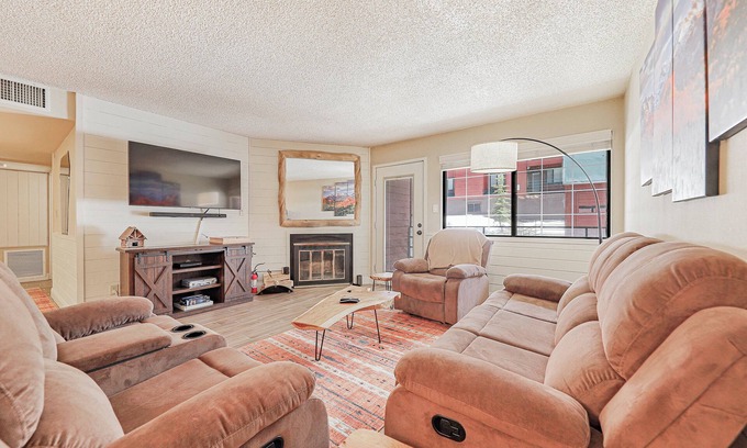 The living room is a cozy retreat with comfortable recliner seating and a flat-screen TV, perfect for unwinding after a day on the slopes. A charming fireplace adds to the ambiance, creating a warm, inviting atmosphere during chilly winter nights.