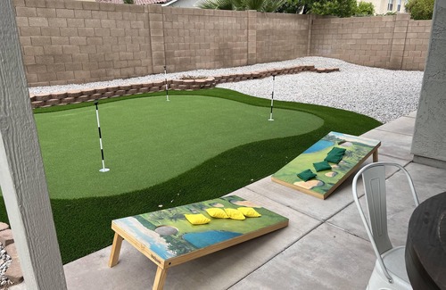 Relax or play in your own backyard oasis with a private putting green, cornhole game, gas BBQ grill, and furnished patio—perfect for fun evenings under the Arizona sky.