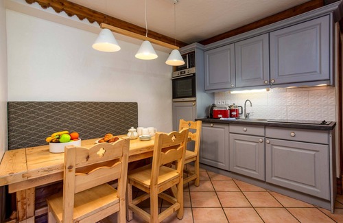 Ginabelle 14 apartment is a central, 2 bedroom apartment which benefits from luxury holiday rentals amenities of swimming pool, sauna, hammam and gym access within the residence. The apartment has one master super-king bedroom with ensuite bathroom, as well as a second bedroom which can be made as a twin room or super-king. In addition there is a family bathroom with bath and overhead shower, as well as a second separate WC. In the living area are a comfy sofa, TV and games, as well as doors which open out onto a spacious balcony with sweeping views of Les Planards ski area and up the valley towards Le Tour. The adjoining dining area in Ginabelle 14 apartment has seating for 6 with three dining chairs and a bench along one side, while the kitchenette is equipped with more luxury holiday rental essentials, including dishwasher and Nespresso coffee machine. The apartment also benefits from underground parking, private ski locker, washing machine and wifi internet access.