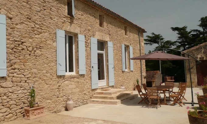 Situated in the middle of Bordeaux's vineyard right in the heart of Dordogne's valley, this house has been entirely renovated and diviided into 2 holiday rentals. It enjoys a big terrace with a view over the surrounding countryside. Access to your rental and terrace via a lovely stone staircase. Ground floor : spacious open plan living/dining room, fully fitted kitchen, wc. Upper floor¨(spiral staircase) : relaxing area, 2 bedrooms with en suite bathroom/wc, 1 bedroom with en suite shower room/wc (2 double beds and 2 single beds). House linen include for week stays (to rent for short stays). Domestic animals accepted with a deposit. Electrical heating. House cleaning in option. Wifi available.