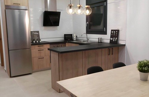 The accommodation also includes three private bathrooms, each with a shower and a hairdryer. The kitchen is fully equipped with modern appliances such as a refrigerator, dishwasher, microwave, and oven, as well as kitchen utensils and tableware. Guests can enjoy meals in the indoor dining area or on the outdoor terrace, which is also furnished with outdoor furniture.