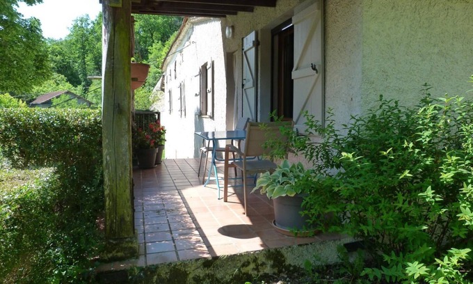 In the South-West of the Lot, small pleasant gîte situated in a green setting, benefiting from a covered terrace and an unobstructed view. Gîte on the hillside, accessible by two flights of stairs and adjoining the owners' dwelling: independent access and private garden without any opposite. You are close to the departments of Lot-et-Garonne and Tarn-et-Garonne, in a quiet and relaxing environment.Living room (TV, relaxation area), kitchenette, 1 bedroom (1 bed 1,40m), shower room, independent wc. Gas heating, double glazing, plenty of storage space. Covered terrace, garden furniture, private garden.