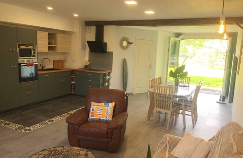 Gîte located in the outbuildings of an old farm, surrounded by nature and close to the owners' home. On the ground floor, the living room offers a pleasant lounge, a fully equipped kitchen (induction hob, dishwasher, microwave) in pastel colors and its dining area. Complete sanitary facilities (shower, toilet) are accessible from the living room. The large bay window opens onto the fenced garden facing south (wooden fence without mesh). Upstairs, a corridor leads to 1 first bedroom with 2 90 X 190 beds, a second bedroom with 1 160 X 200 bed and a master bedroom with 1 160 A terrace with garden table and benches, wooden armchairs, a SPA accessible only for weekly rentals and a bowling alley (balls provided) to fully enjoy the nicely landscaped exteriors and the surrounding calm. Plancha and barbecue. WIFI connection. Electric heating extra. Washing machine and dryer in ground floor bathroom. Baby equipment available: high chair and travel cot. Cleaning included in the price. Possibility of renting sheets (25 euros/stay for 160 beds, 15 euros/stay for 90 beds).