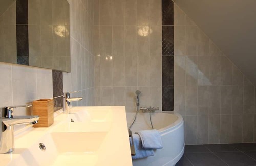 Independent house with basement. Living room with kitchen area (oven, microwave, dishwasher, freezer). Laundry room (washing machine, dryer). Bedroom 1 (1 140x190 bed). Bathroom. toilet. Upstairs: Bedroom 2 (1 140x190 bed). Bedroom 3 (140x190 bed). Bathroom. toilet. Bedroom 4 (140x190 bed with additional bunk bed). Baby equipment. TV. Wifi internet. Electric heating extra. Sheets and towels provided in high and very high season, rental during other periods. End-of-stay cleaning service at extra cost. Private enclosed land. Terrace. Garden Lounge. Private heated swimming pool (solar) from mid-May to mid-September (8X4m). Deckchairs. Barbecue. Cellar. Car park. Shelter for bicycles. This contemporary house on the hillside enjoys a lovely view of the green hillside. Its vast south-facing terrace and private swimming pool allow you to fully enjoy this panorama. On sunny days, the pool will delight young and old alike. Functional with its basement, this gîte is located in a small, very quiet subdivision in the countryside where a marked trail passes. La Corbinière is only a few minutes from the large sandy beaches. Between the port of Granville and the Bay of Mont St-Michel, Jullouville is a charming seaside resort popular with families. A 2nd neighboring gîte belonging to the owner (8 people with private swimming pool).