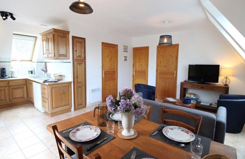 This independent gîte fitted out upstairs has an unfenced plot of 400 m² and an east-facing terrace with garden furniture, parasol, 2 deckchairs and barbecue. Parking in a private car park located on the other side of the road.