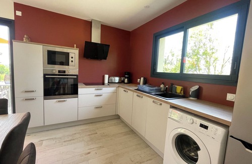 The bright and pleasant main room is completely open to the terrace thanks to its pocket bay window. It has a large 3 x 4m parasol, a large outdoor table for family lunches, a beautiful kitchen equipped with completely new appliances with an oven, a microwave, a washing machine, a washing machine. dishes, a filter coffee maker, a kettle, a toaster...