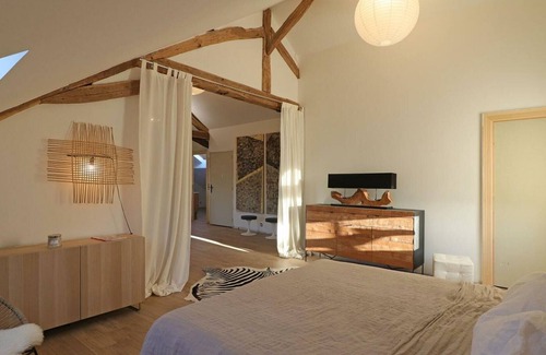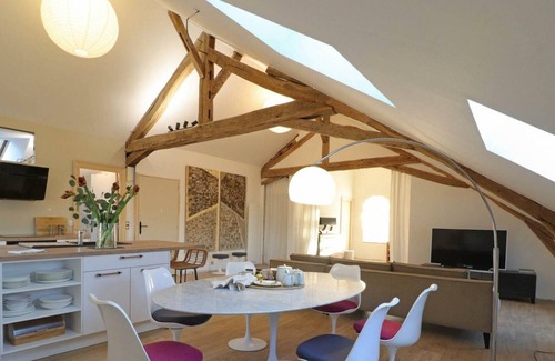 On the second floor of the owners' house (shared access with the owners): Dining room with living room and fitted kitchen. Bedroom area (separated by curtains) with double bed 180 x 200 cm. Non-partitioned bedroom with 2 beds 120 x 200 cm. Shower room with wc. Shared enclosed garden with shelter for bicycles or motorbikes. 2 guest rooms including a suite on the 1st floor can be rented in addition. Provision of a room for 24 people of 100m2 with supplement on request. Possible reservation of reflexology session with supplement on request. Loft of 120 m² with a soothing atmosphere accessible by a vertiginous staircase, as if suspended, under the framework of a residence of character. Monika was able to unearth decorative objects, signed furniture and paintings by artists that have found their place perfectly in this former police station. On the edge of the national forest, you can join the nearby greenway by the paths. Located between Alençon and Le Mêle sur Sarthe, all activities, shops and services are less than 10 km away: horse-riding centre, karting, leisure centre,... WIFI, Enclosed grounds, Washing machine, Television, Dishwasher, Baby equipment, Mid-Week, Heating included, Sheets included, Tumble dryer, Barbecue, Garden furniture, Microwave, Freezer, DVD player, Cleaning included, Household linen, Terrace, Garden, Charm, Electric vehicle recharge, present tourinsoft, present poplidays, mail ok. Unless stated, services such as cleaning, bed linen, towels etc. are not included in the price of this rental. If pets are allowed (information in the advertisement), charges may be applicable. Only equipment mentioned in this advertisement are present. Equipment not mentioned are not considered to be present.