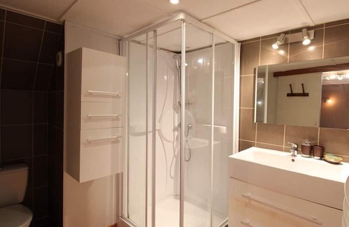 On the ground floor, living room with flat screen TV, kitchen area with fireplace (free wood insert), separate toilet. Upstairs, 1 bedroom with 1 double bed and 1 single bed, bathroom with toilet. Baby equipment available: bed, high chair, bathtub. Oil central heating (75€/week), electric heating according to consumption for the bathroom.