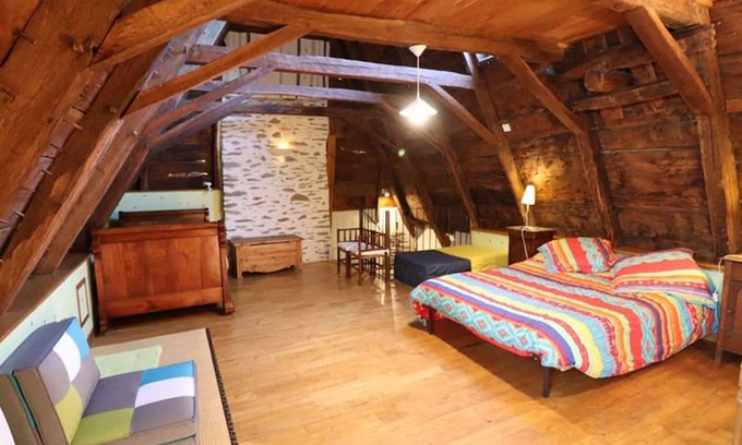 Large bright kitchen with level access. On the raised ground floor, living room with fireplace (free wood stove), flat screen TV, DVD player, telephone, wifi Internet access, 1 bedroom with 1 double bed, shower room, separate wc. On the 1st floor, large bedroom with 1 double bed, bathroom with wc. Small mezzanine in the attic with 1 double bed (access by staircase type miller's ladder). Electric heating included. Prices all charges included.