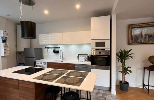 Ground floor: entrance to the equipped kitchen with central island (4 vitro hobs, washing machine, dishwasher, electric oven, microwave, fridge-freezer).