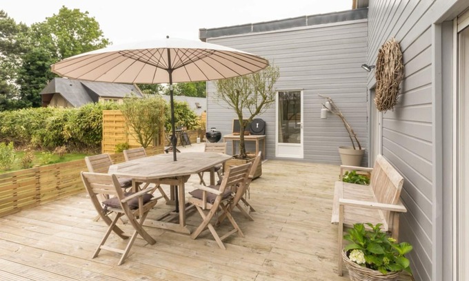 Ground floor : - stay, - living room (flat screen TV), - kitchen (freezer, 4 gas burners, oven, robot...), - laundry room (tumble dryer, washing machine), - separate toilet, - 1 double bedroom (2 single beds 90x200cm) with private shower room, Upstairs: - 1 double bedroom (2 single beds 90x200cm) with private bathroom. Outside: Beautiful private terrace with dining area, relaxation area (sunbathing), open garden adjoining the owners' garden. A stone's throw from Le Havre, you will be welcomed in a renovated house full of charm. This cottage located on the same land as the owners will surprise you with its cozy decoration and its beautiful living spaces: this house is an ideal vacation spot to take the time to visit Normandy. Rental charges not included in your rental: - heating, - electricity (payment of electricity after meter reading on arrival and departure above 8 kw/h per day, at cost price), - Household chores, - the tourist tax. bedroom(s) on the ground floor, TV, electric heating, bathroom. (bath), Sheets provided, Household linen, Internet connection, Private car park, Washing machine, Dishwasher, Cleaning fee, Pets on site, Terrace, Garden, Tumble dryer, Microwave, Flat screen TV, Freezer, Garden furniture, barbecue, detached house. Unless stated, services such as cleaning, bed linen, towels etc. are not included in the price of this rental. If pets are allowed (information in the advertisement), charges may be applicable. Only equipment mentioned in this advertisement are present. Equipment not mentioned are not considered to be present.