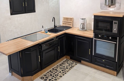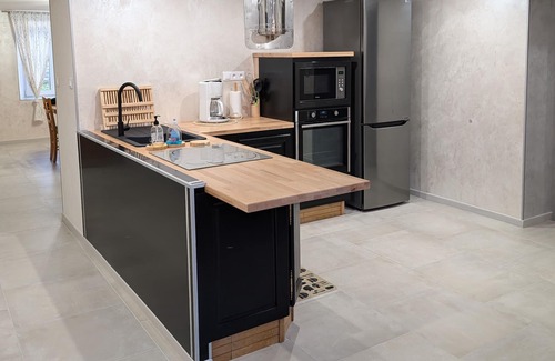On the ground floor, enjoy a large modern and functional kitchen, perfectly equipped with coffee maker, kettle, toaster and everything you need to prepare your meals. The large living room, equipped with a beautiful table, chairs and a wood stove, offers a friendly and warm setting.