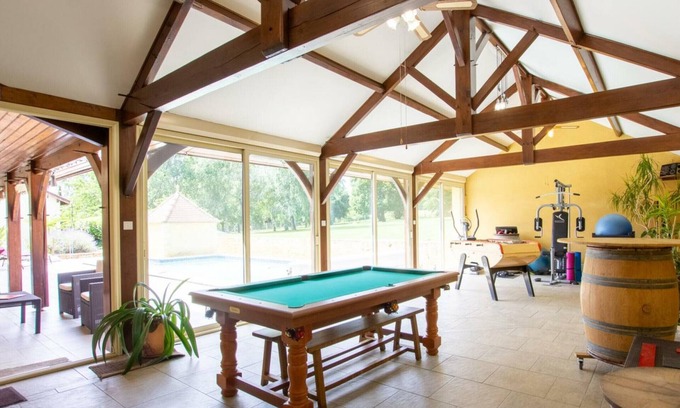 Garden furniture, Single storey, Fireplace/Stove, Television, Enclosed grounds, Courtyard, Private swimming pool, Ping-pong or billiards, Gym, Internet or Wifi, Baby equipment, Parking, Equipment storage room, Washing machine, Dishwasher, Freezer, Barbecue or plancha, DVD player, Microwave, Oven, Combined freezer, Terrace, Garden, Sheets/linen included, Shower room, Pod machine, Individual house.
