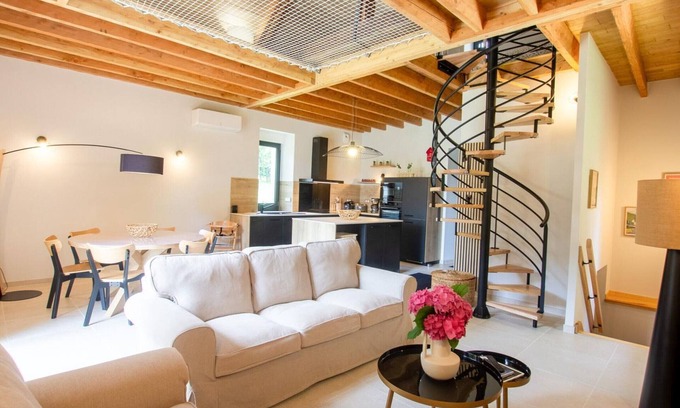 From the private car park, access the living room with a fully equipped modern kitchen, a comfortable living room opening onto a suspended wooden terrace. A separate toilet. Relax while enjoying the 2 terraces with views of the countryside and the owner's private pond. You will be lulled by the gentle sound of the stream that passes below the land.