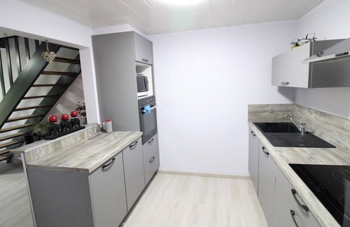 On the ground floor, equipped kitchen area, dining room with pellet stove (€7 per bag). On the half-level, living room with flat screen TV and internet access with fiber, 1 bedroom with 1 bed 160X200, laundry room, shower room with toilet. Upstairs, 1 bedroom with 2 single beds, 1 bedroom with 1 bed 140X200. Electric heating according to consumption. Pet deposit €50 and cleaning deposit €60. Possibility of renting with gîte 809.